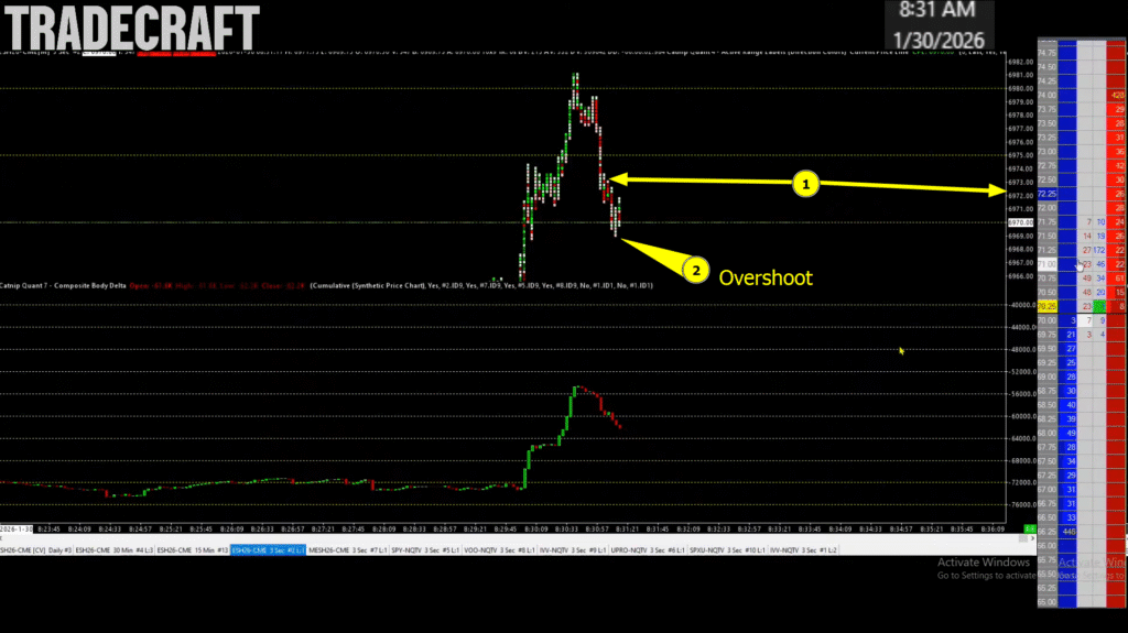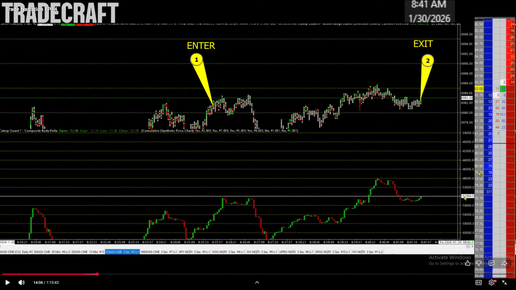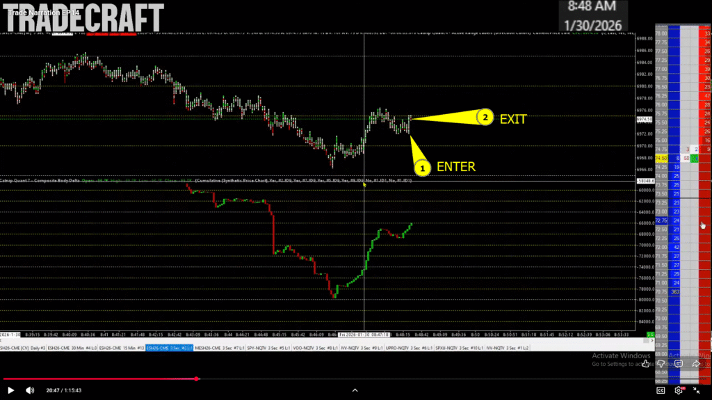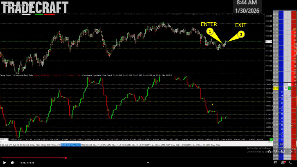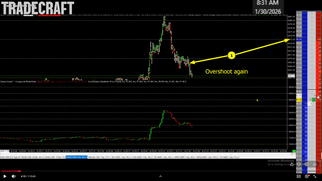 Trade 4 is another boomerang setting up high of day. I get in and it works instantly. I hold, then it comes in re-setting up for another boomerang. So the volume setup twice on my hold. This could potentially snap up hard but it then fails. It fails fast and hard going against me nearly 10 points. I freeze up a bit on this however the market v flushes back to entry. I notice this sloshing effect on the volume and start to lean into that a bit more. This is killing me but if I can lean into it I can get momentum. The market is spoofing which lag pulls this volume. There’s such huge inventory imbalance I sit in it. Now I don’t think this was the smartest trade. Something like this can get worse fast. However I notice the market sets up another boomerang right near me and I hold for another momentum pop. The market hesitates and sets up another boomerang flicking again up in my favor but now inventory is imbalanced against me so the market flushes back and I essentially bail for a break even.