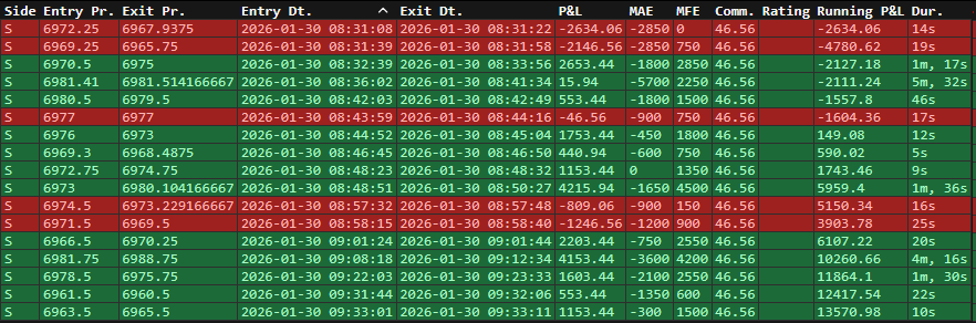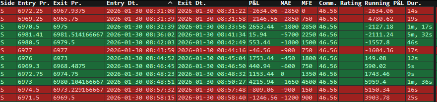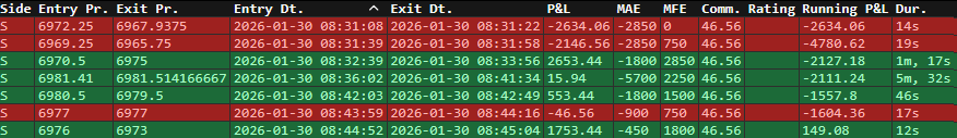 Trade 7 sets up for another downside boomerang in roughly the same spot. I get in and the fucking volume sloshes against me and this would normally be a failed setup but the book was balancing at this point. I had inventory favor to the low. As soon as I entered, the price stalled and sort of stabbed lower. I held and got a second wave of momentum as I noticed the book broke out and a ton of selling was coming in. A nice $1753 now at this point my rolling PNL is +$149. I had got back in the game after those two initial massive hits.